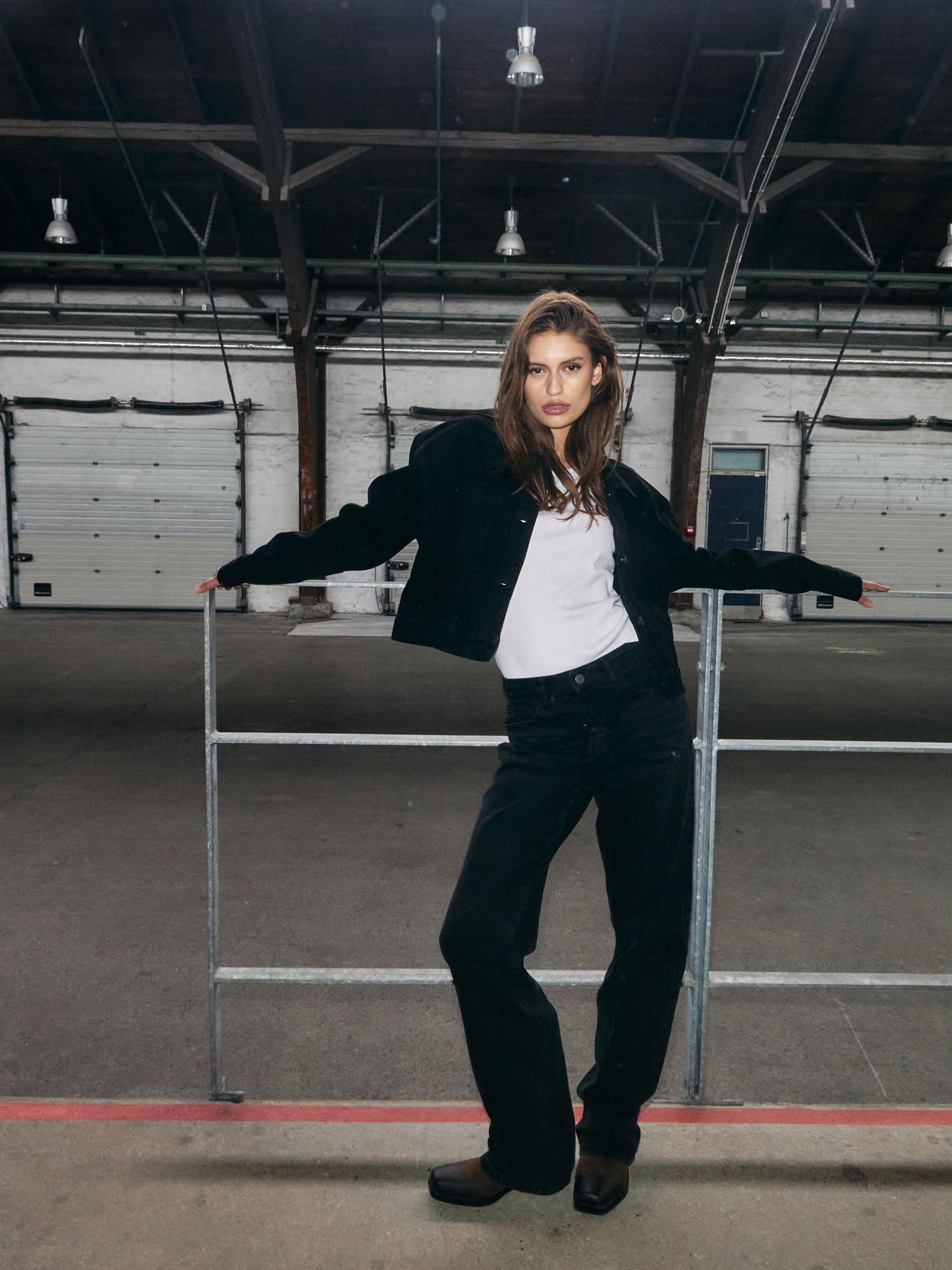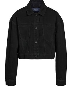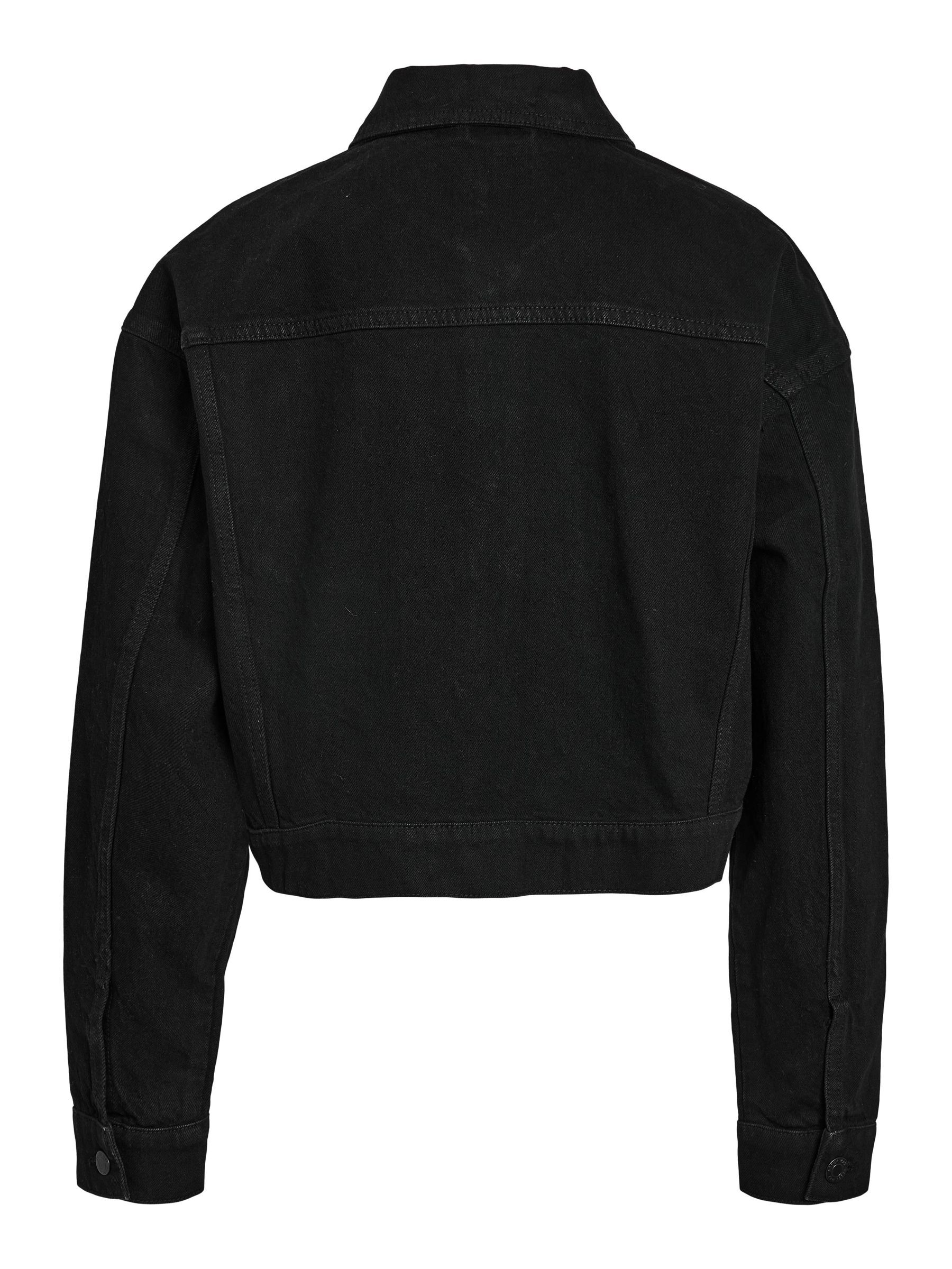 – Cropped denim jacket- Spread collar- Dropped shoulders- Long sleeves- Button-up front- Patch pockets at chest- Regular fit- Model is wearing size M