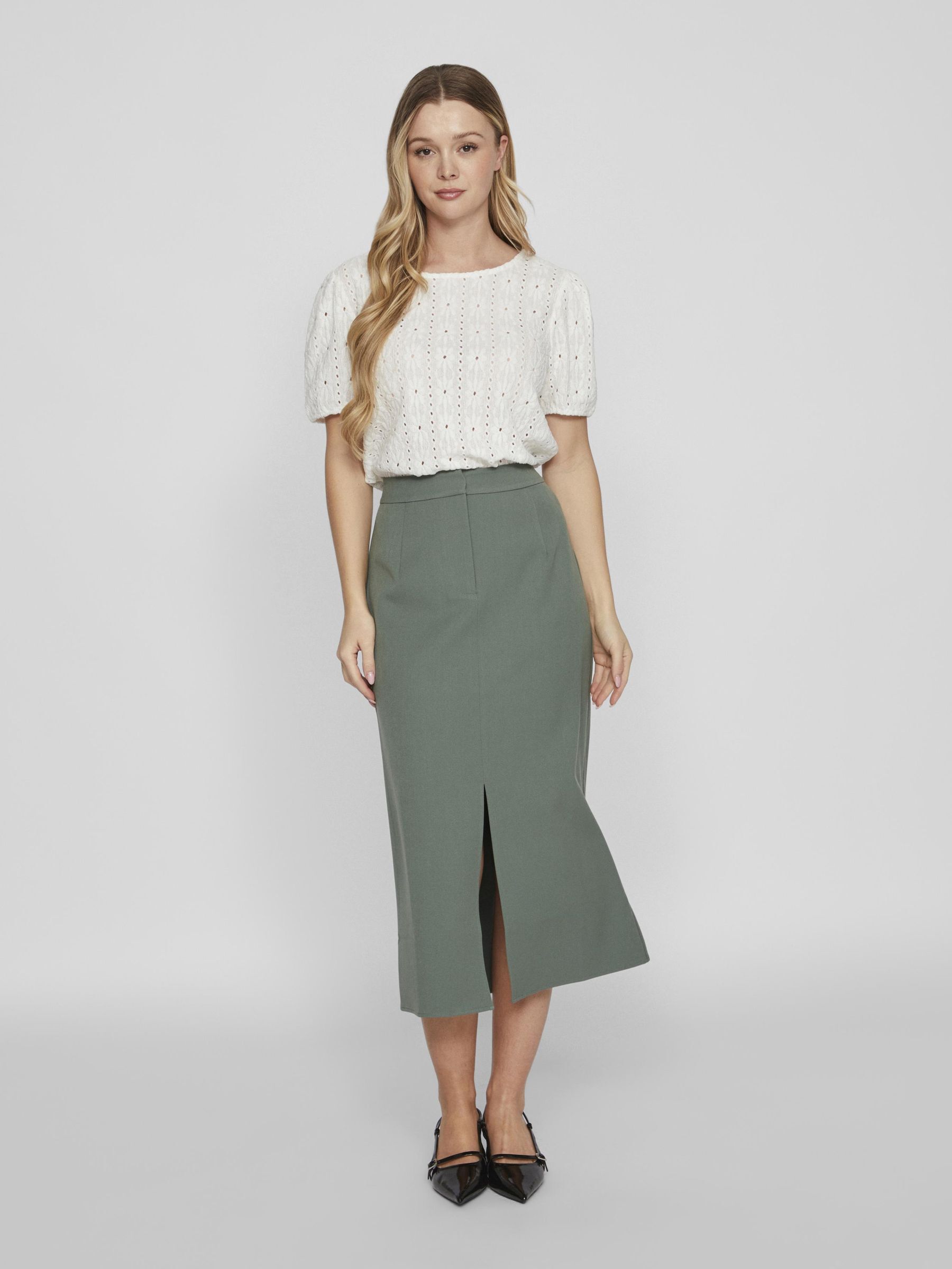 • High waist midi skirt• Front slit detail• Zip-up fly with hook and button fastening• Stretch-back waist• Regular fit • Length: 129 cm in size 38