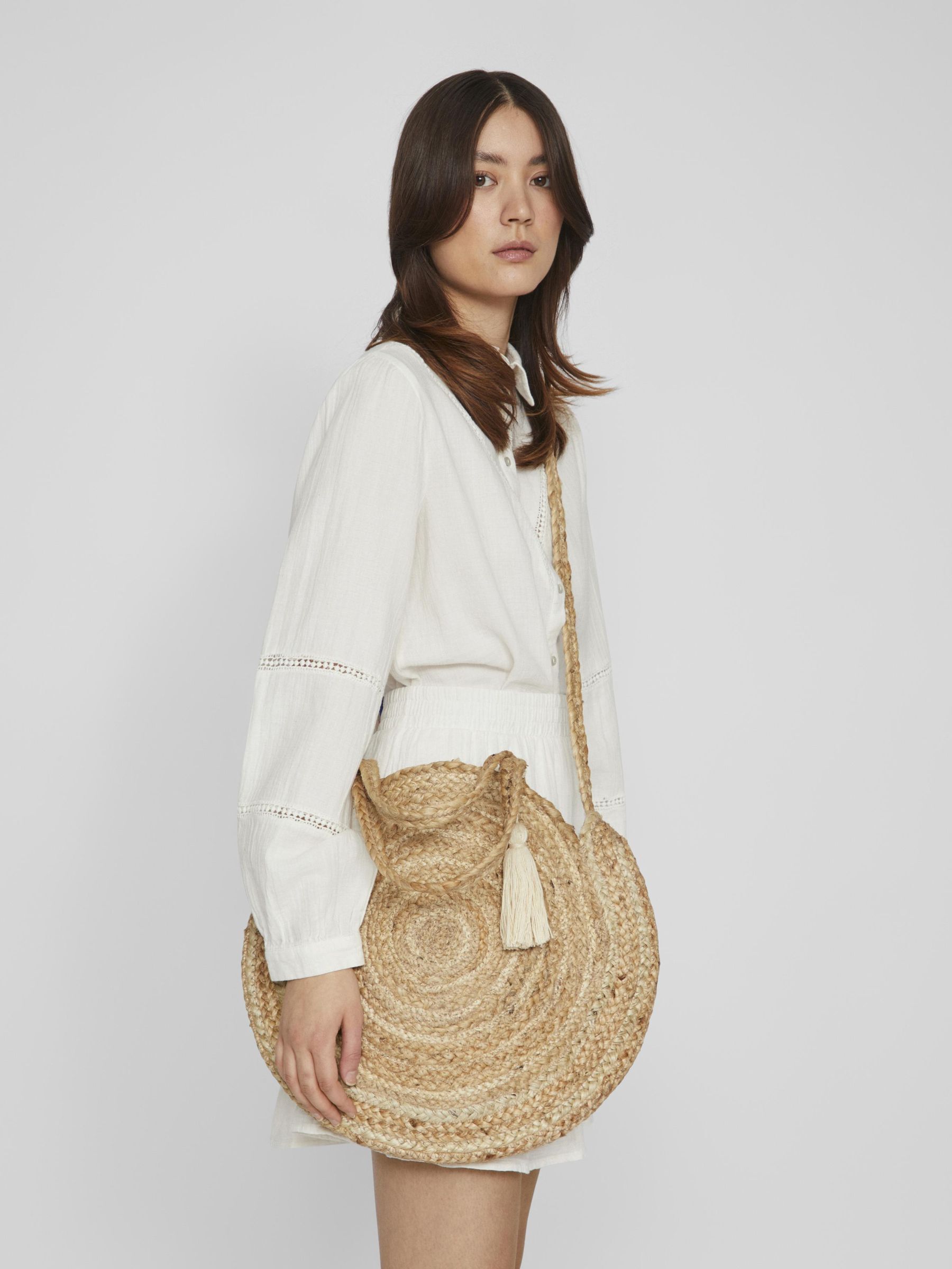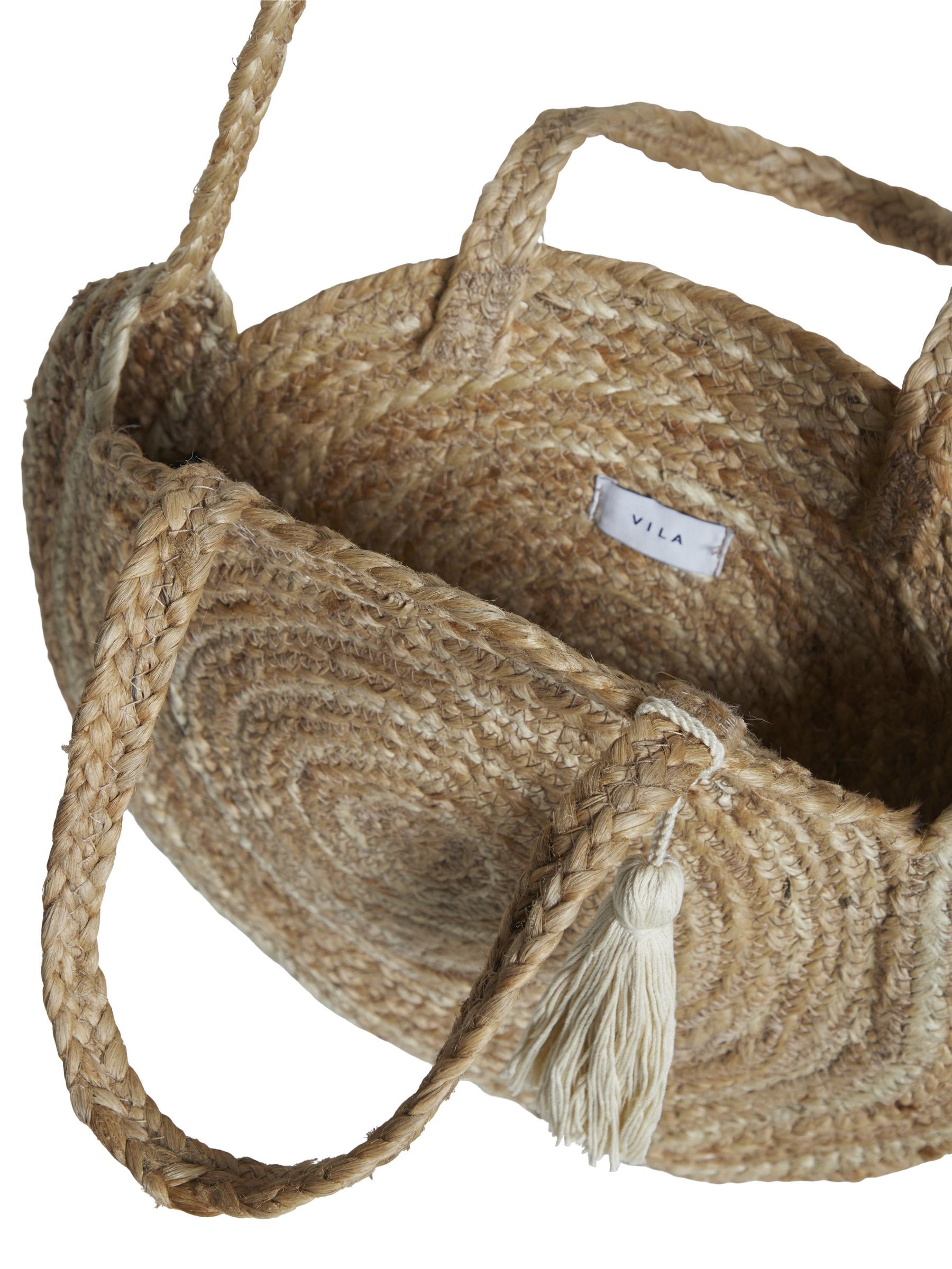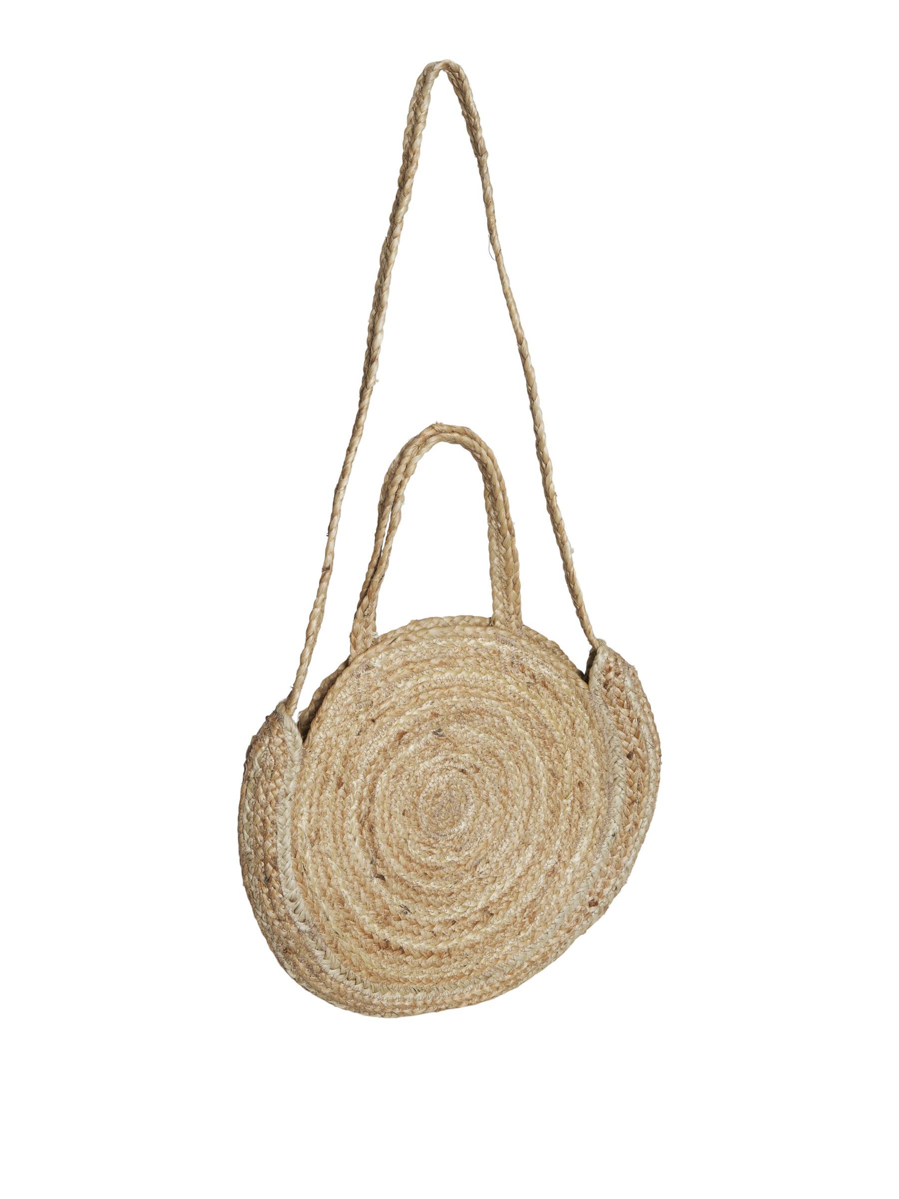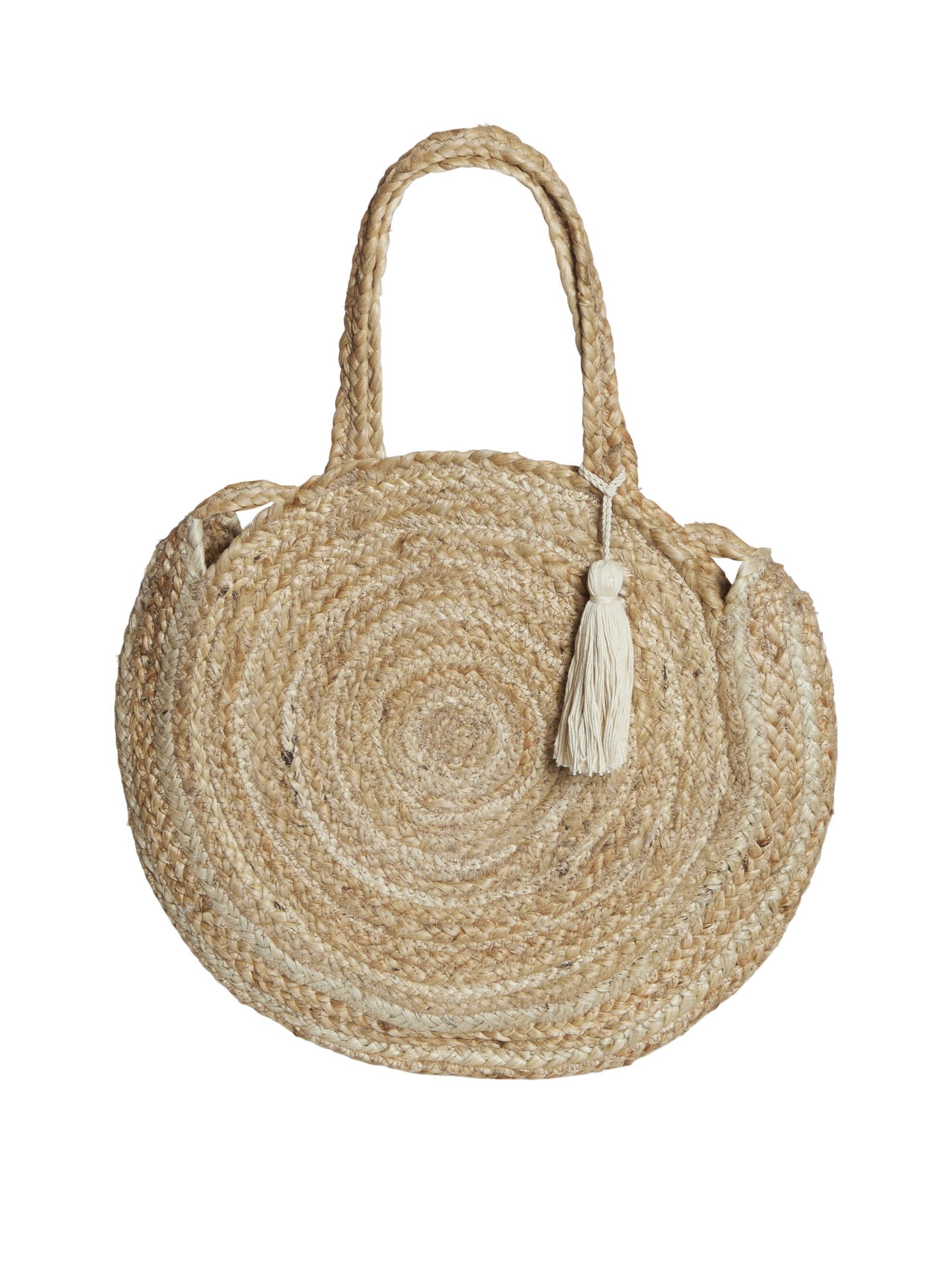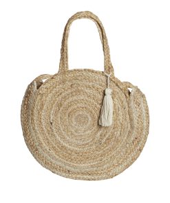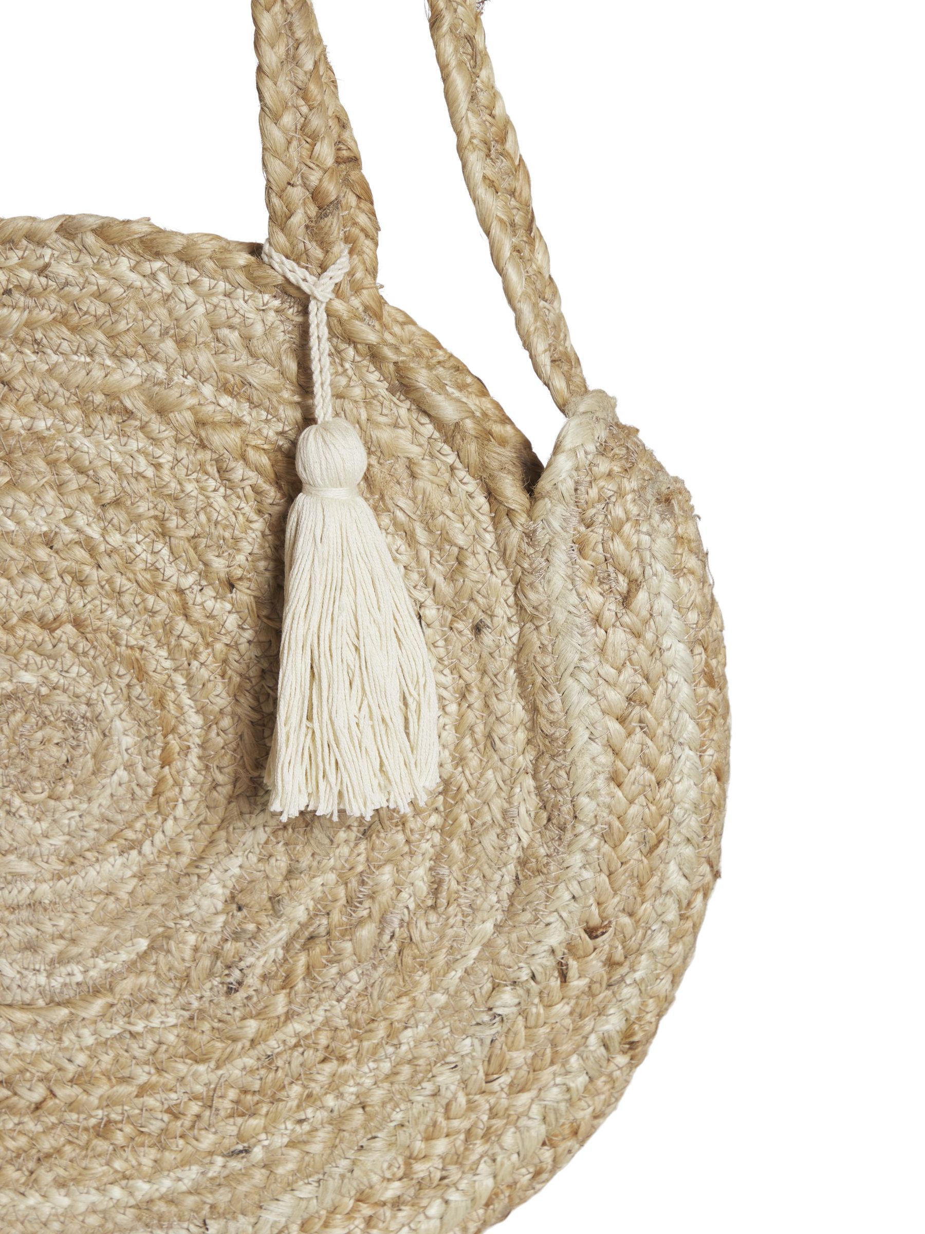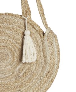 • Round jute bag• Braided straps• Use it as both handbag and shoulder bag• Tassel detail