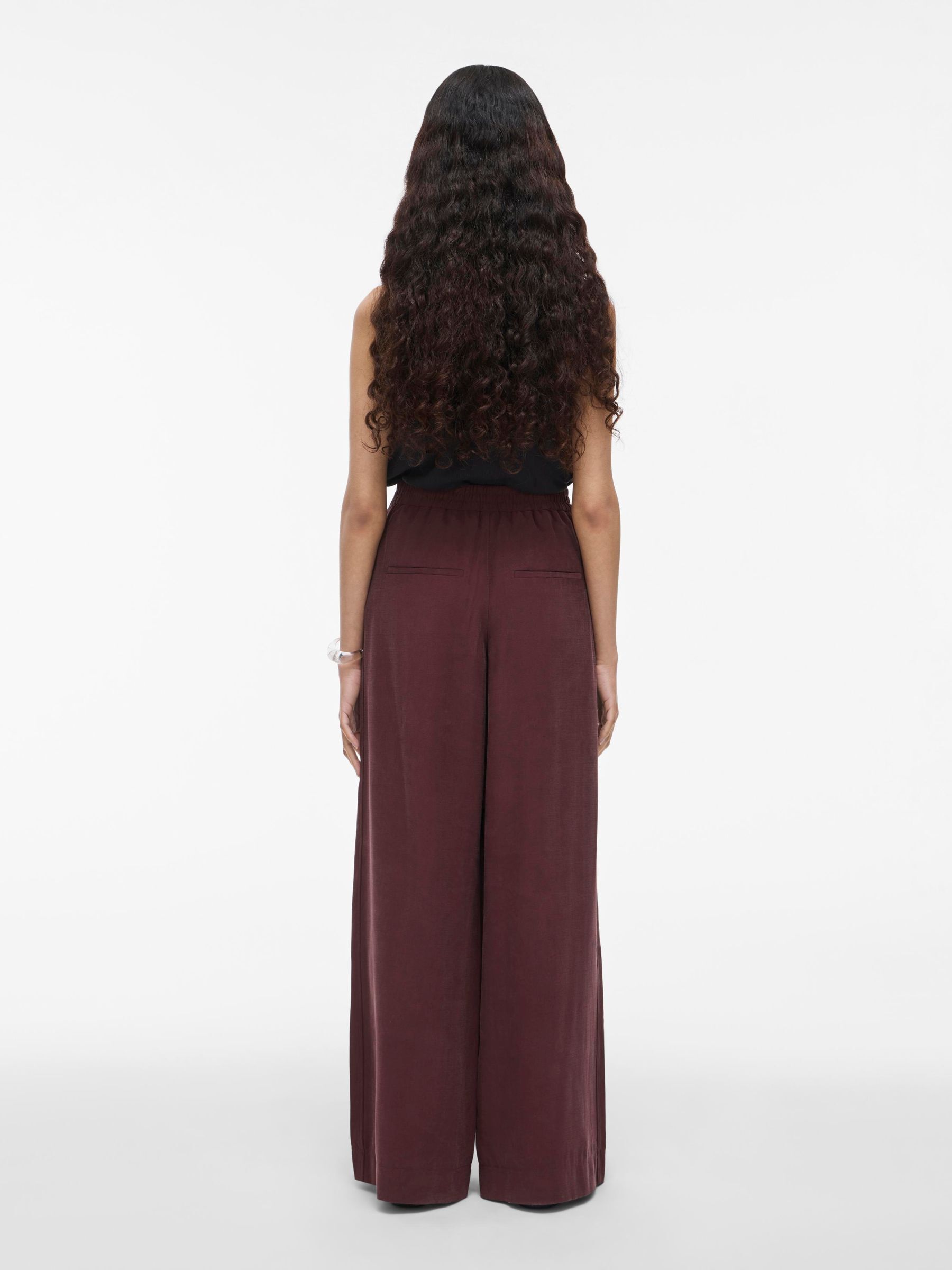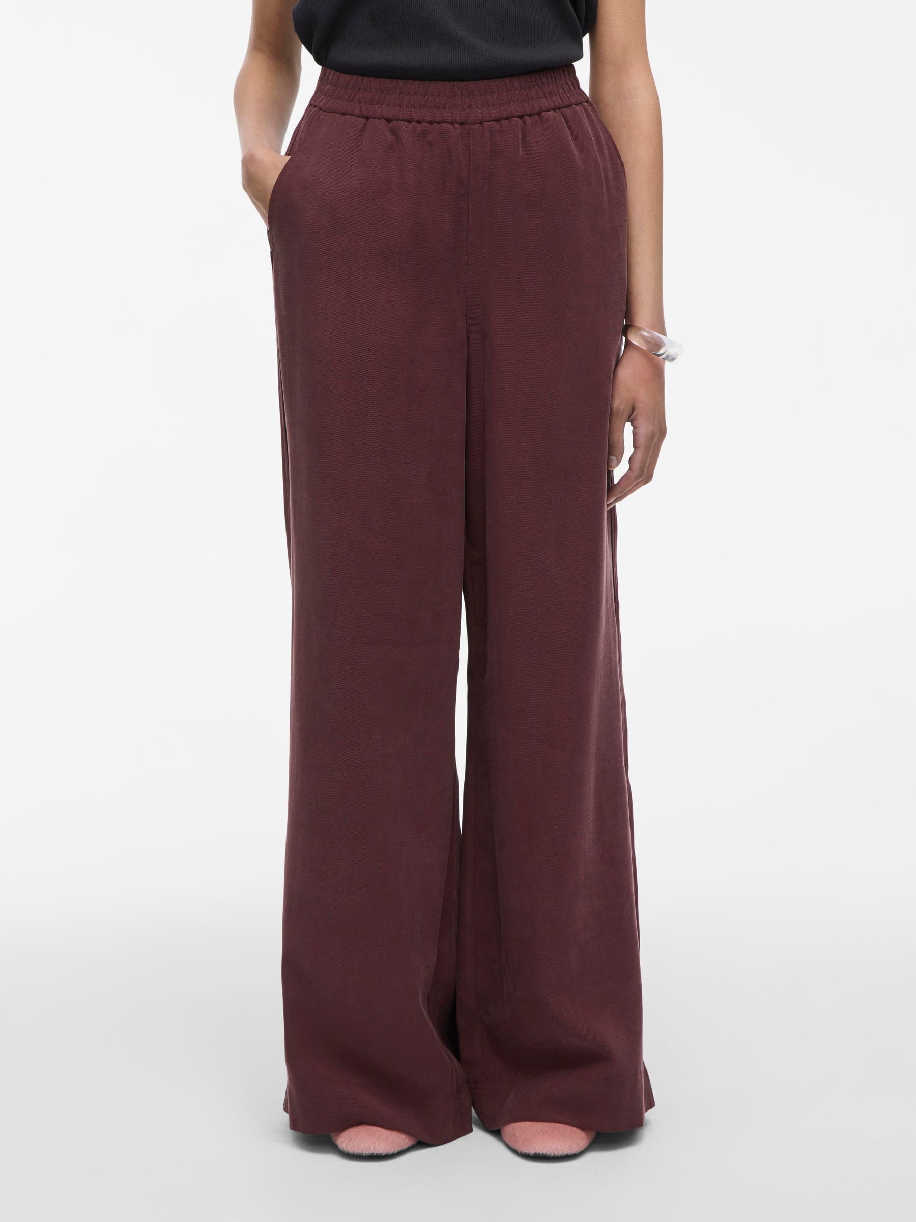 • Wide-leg trousers• Mid-waist• Elastic waistband• Side and back pockets• Regular fit• Inseam: 80 cm in size 38• Frontrise: 28 cm in size 38