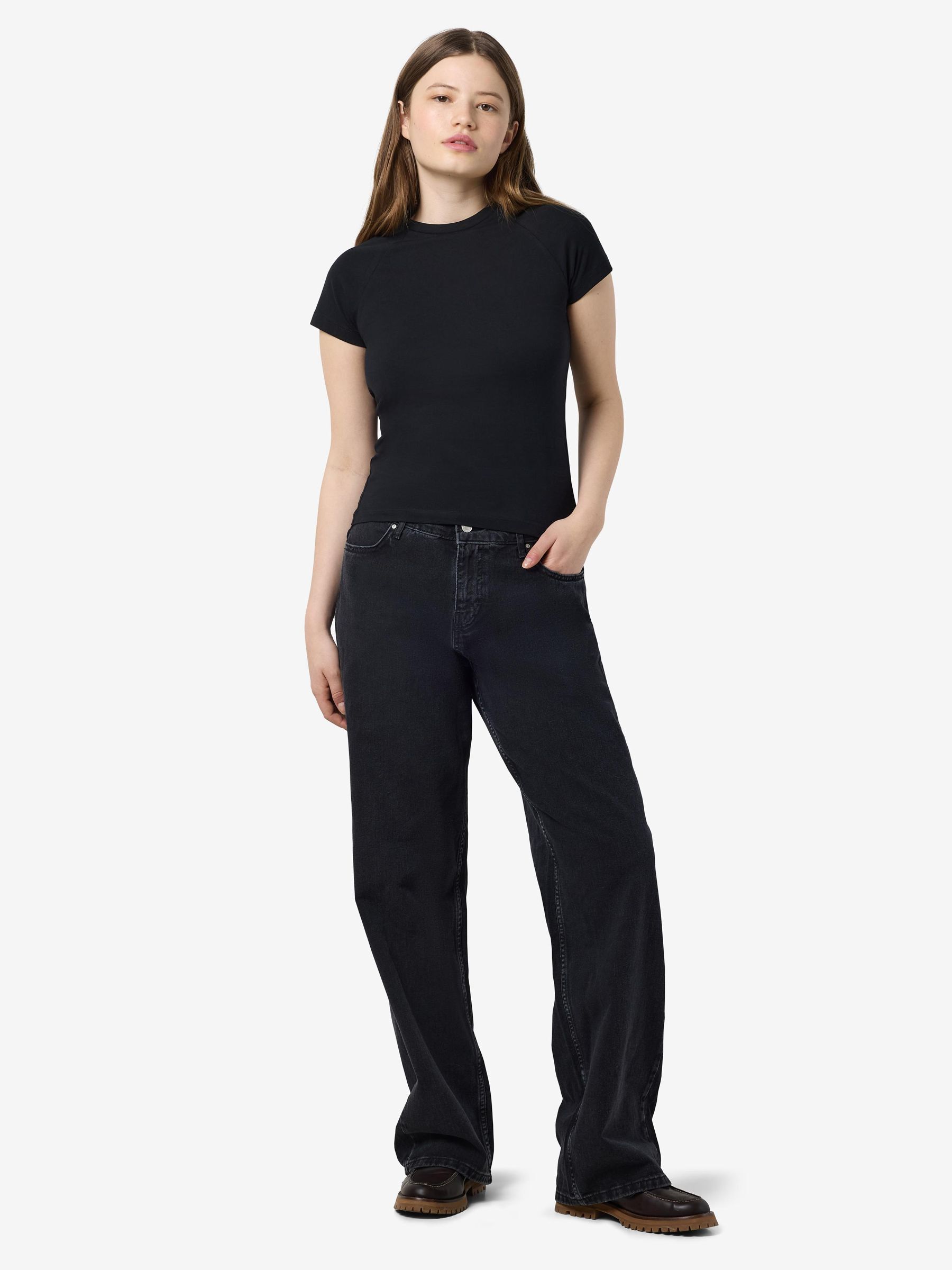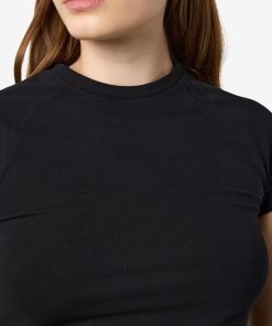 – Basic t-shirt- Round neck- Short raglan sleeves- Tight fit- Model is wearing size M