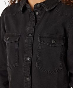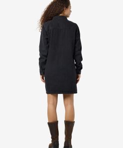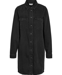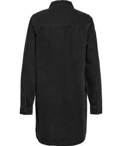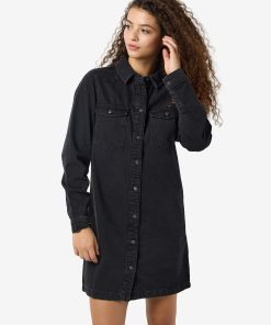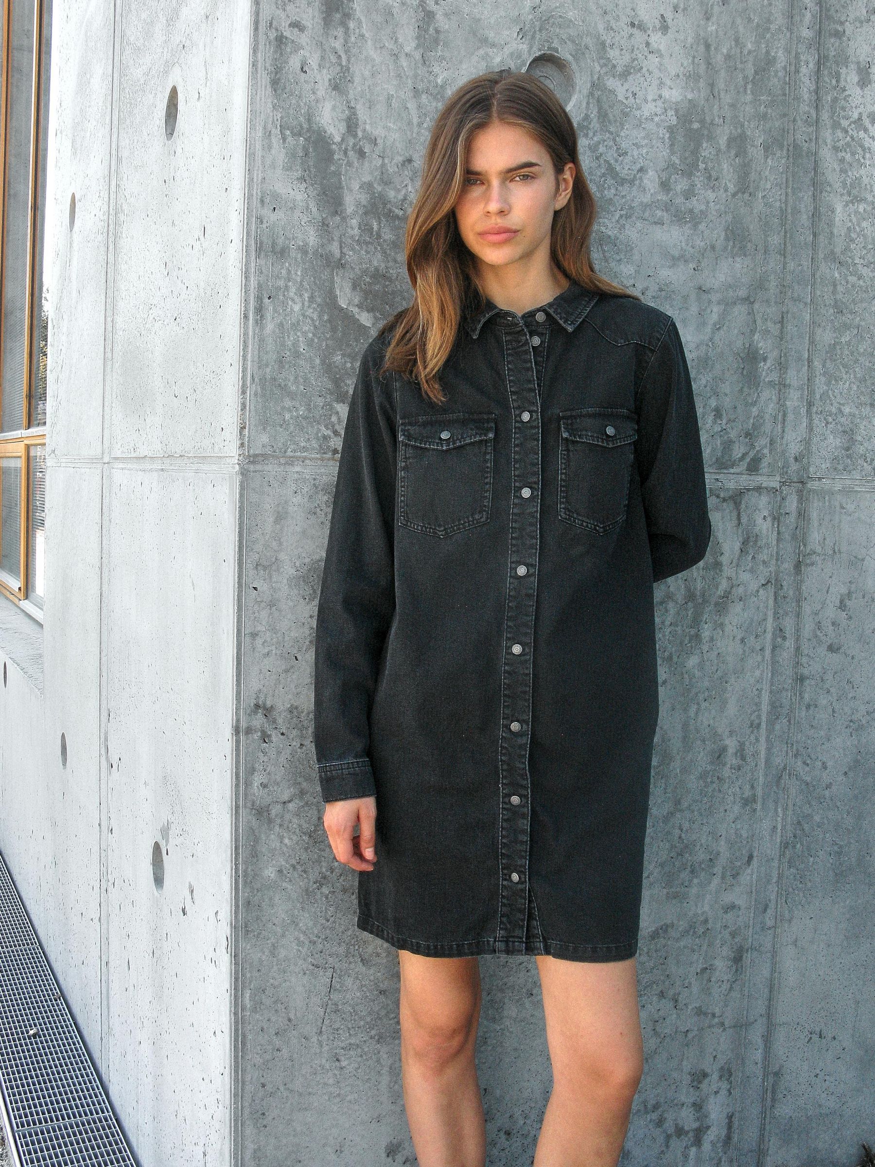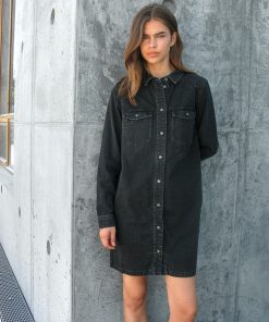 – Mini length denim dress – Spread collar – Dropped shoulders – Long sleeves with button cuffs – Patch pockets at chest with button fastening- Button-up front – Regular fit
