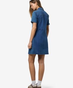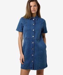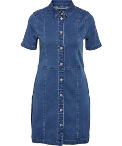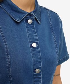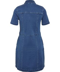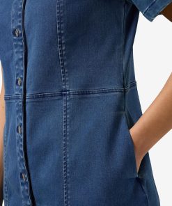 – Denim mini dress- Regular collar- Short sleeves- Button-up front- Regular fit