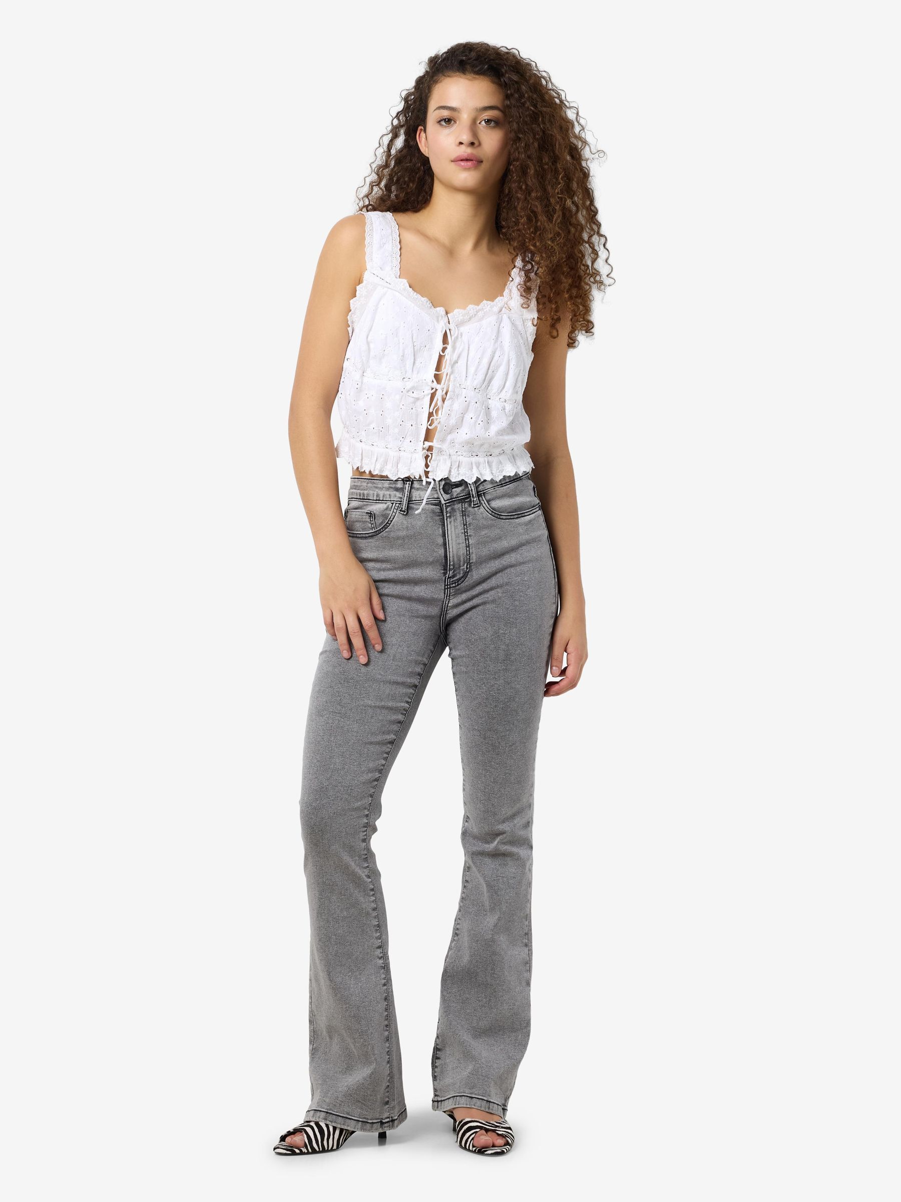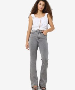 – High waisted flared jeans- Belt loops- Jacron patch- 5-pocket design- Zip fly with rivet button fastening- Flared fit