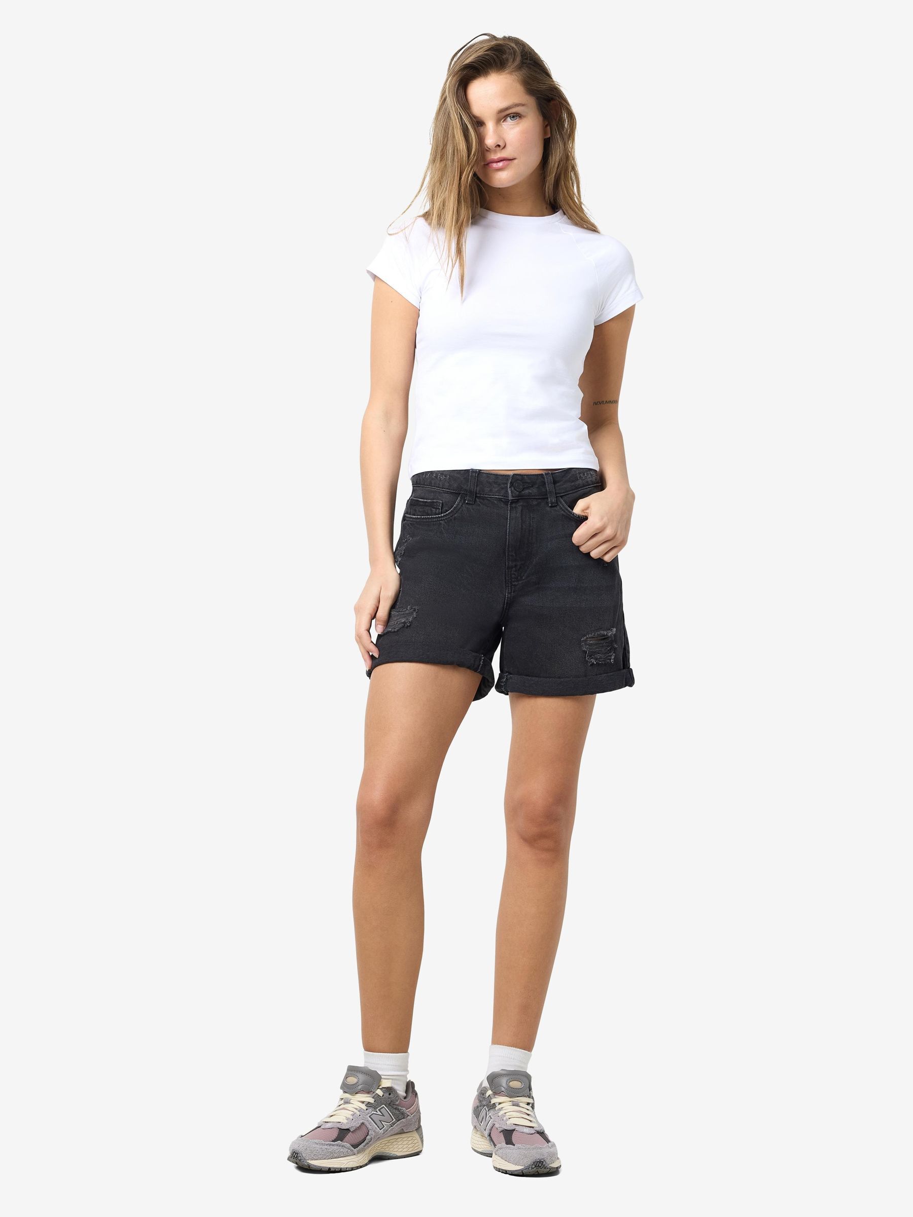 Denim shorts with normal waist, distressed details and turn up details. Style the denim shorts with a t-shirt and sneakers for an effortless summer look.