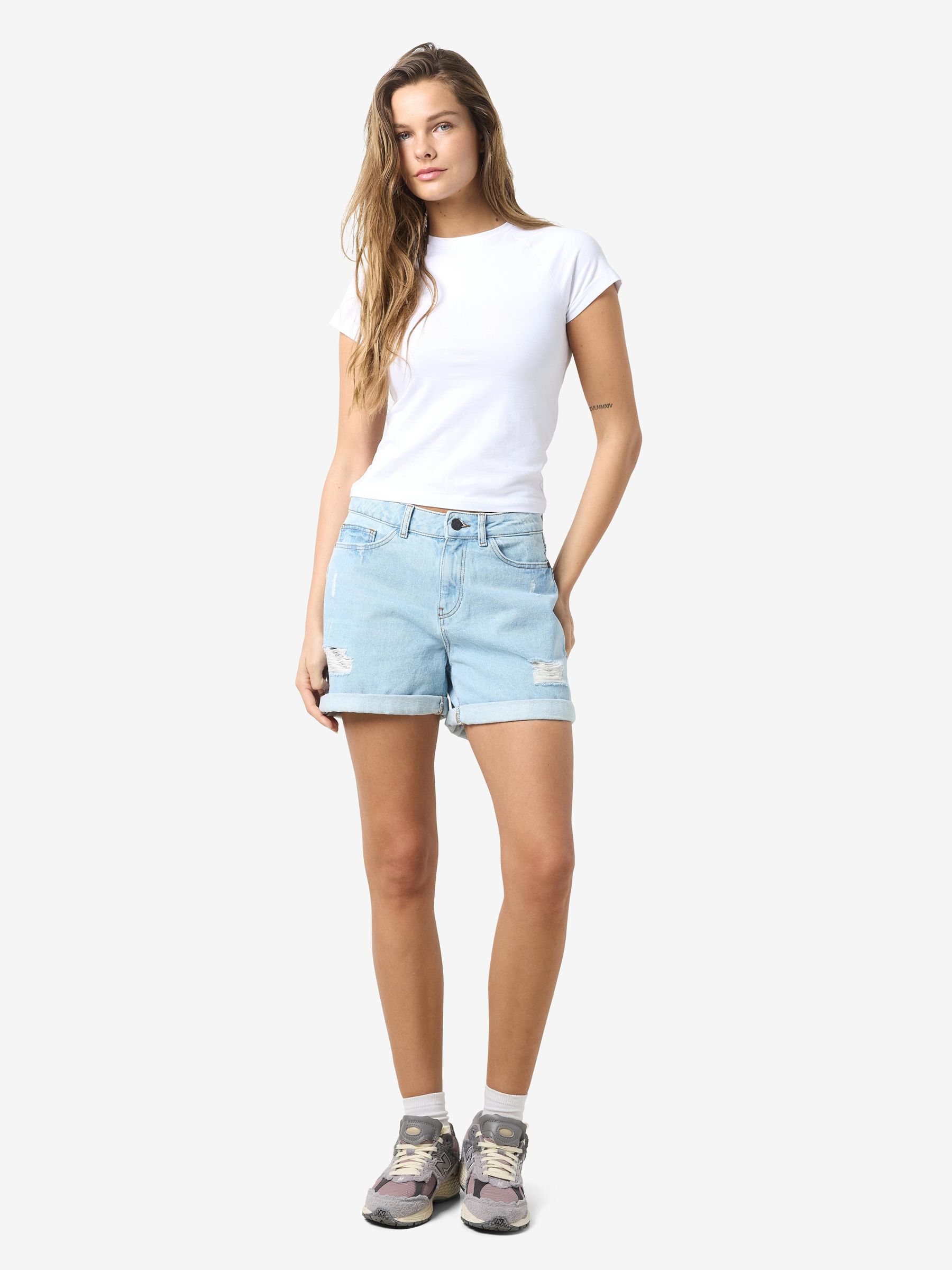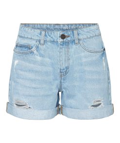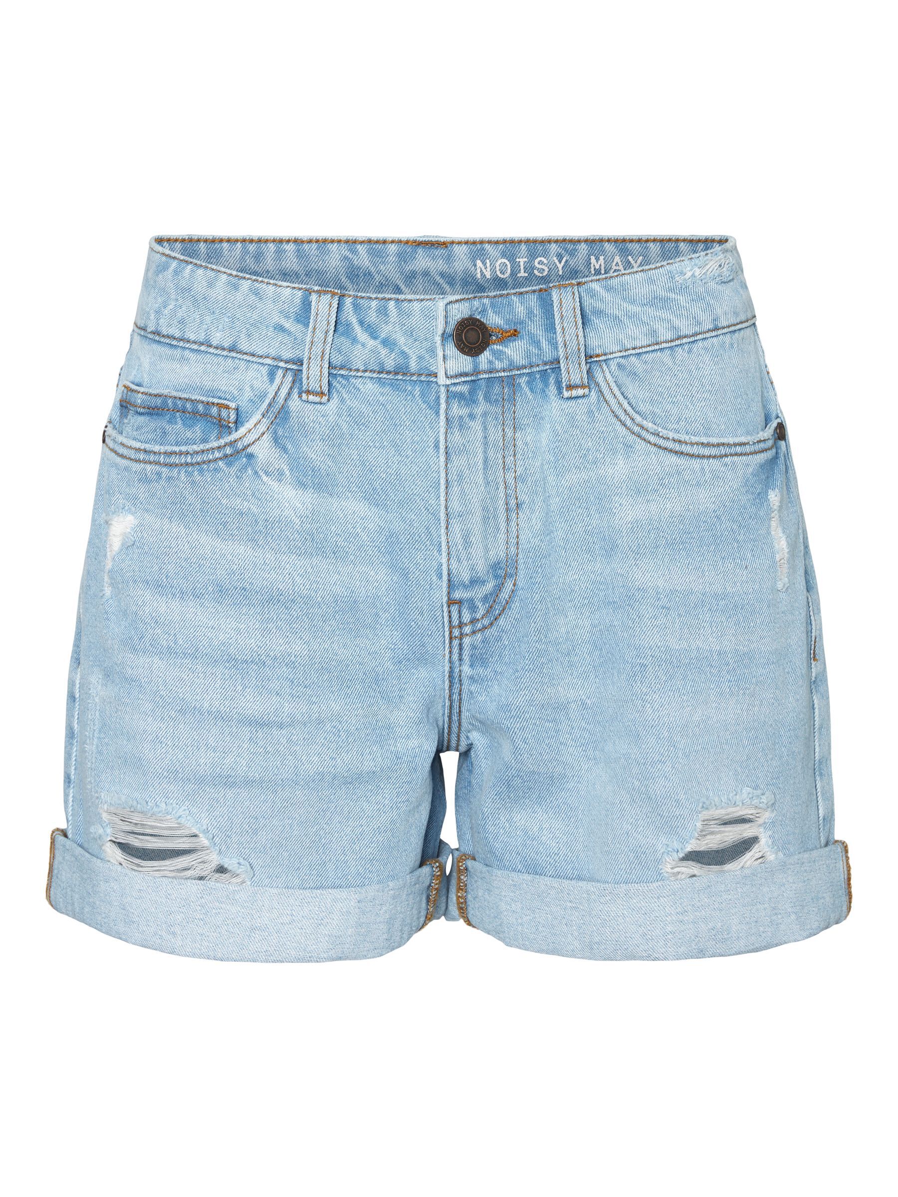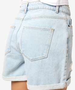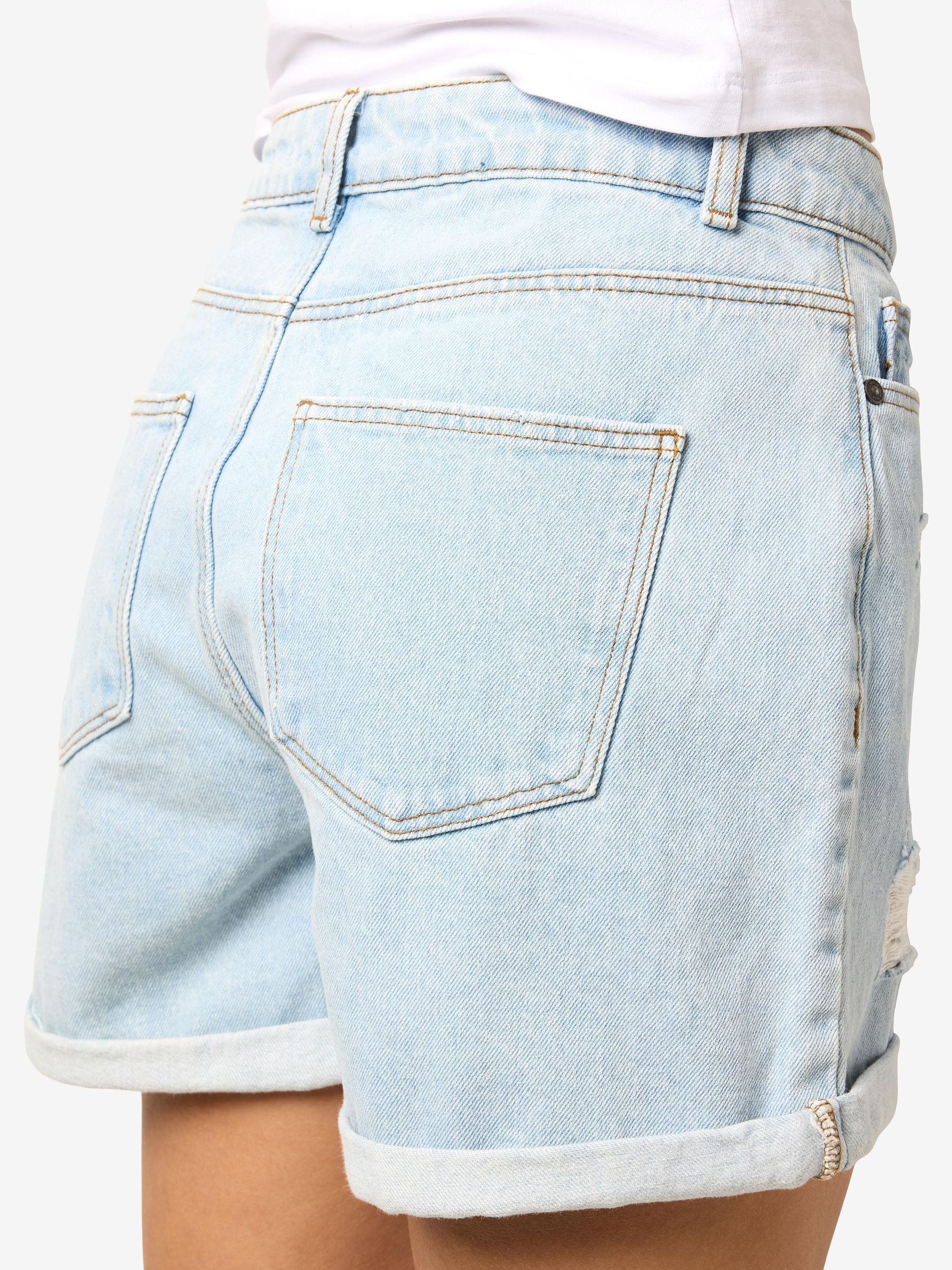– Denim short with turn up detail- Normal waist- Soft, non-stretchy cotton material- Five pockets- Distressed details- Inseam: 11 cm in a size S