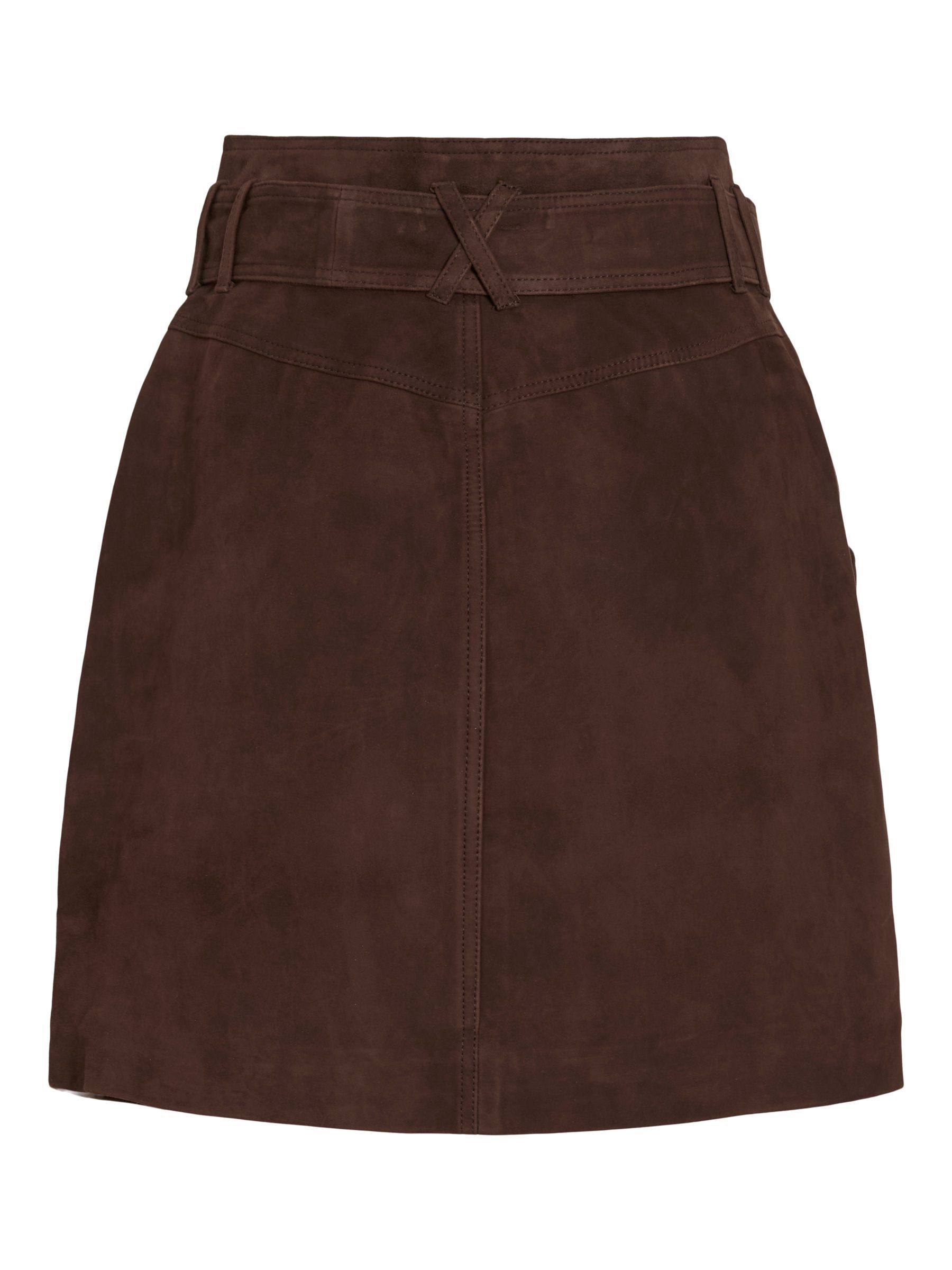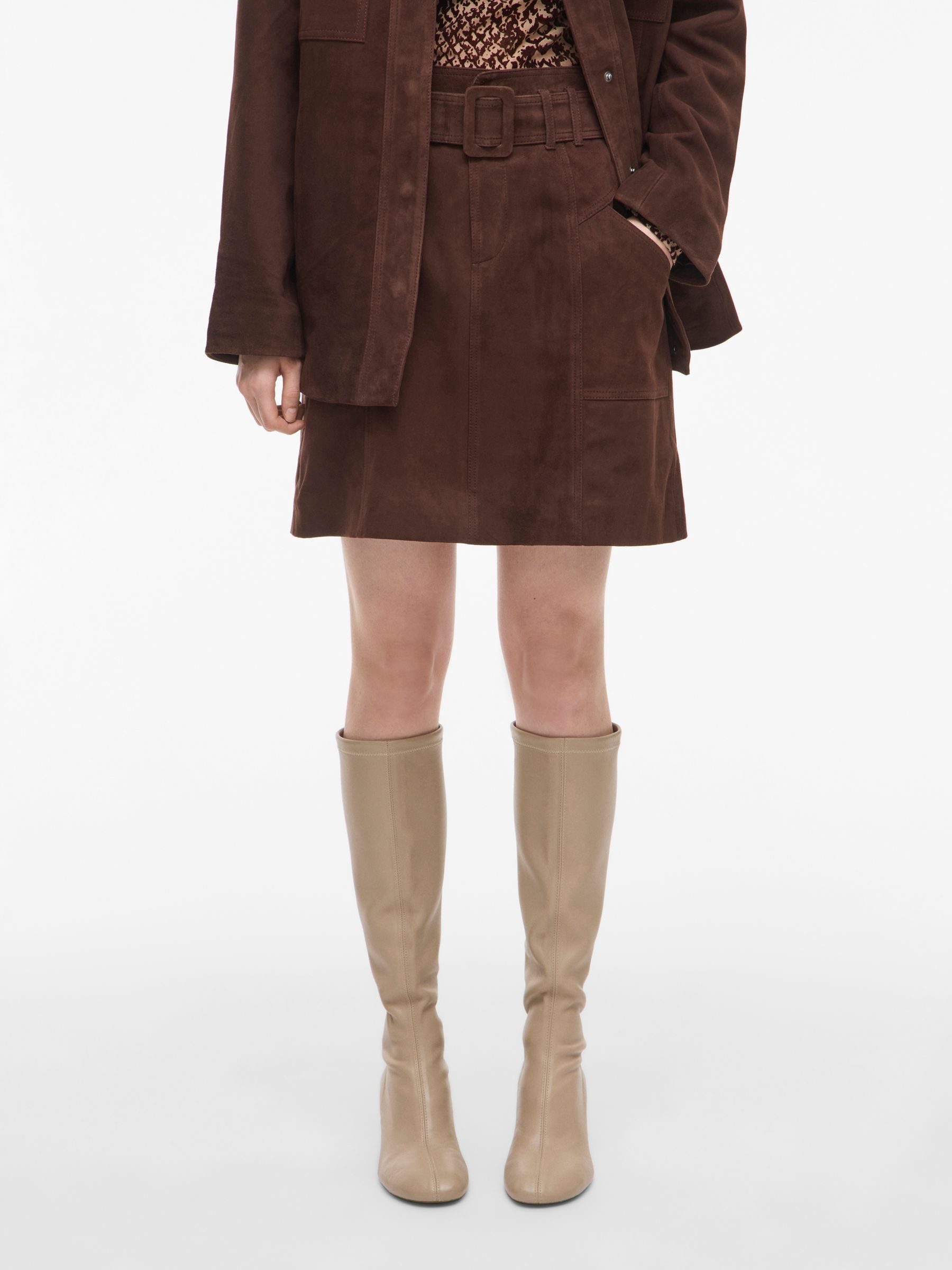 • Mini suede skirt• High waist• Zip and button fastening• Belt loops• Removable belt• Front pockets• Regular fit• Length: 98 cm in size 38