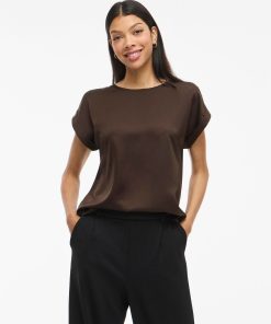– Short sleeved, round neck top- Satin-look – Light material- Non-stretchable material- Length: 61 cm in size 38 – Sleeve length: 11 cm in size 38- Our model is 178 cm tall and wears size 38