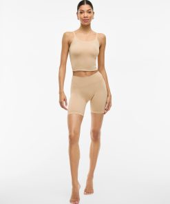 – Mini shape shorts – Stretchable fabric – Ribbed waist – Inseam: 12 cm in size 38- Front rise: 18.5 cm in size 38- Our model is 178 cm tall and wears size 38