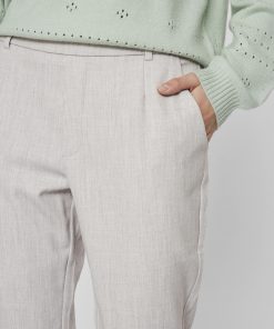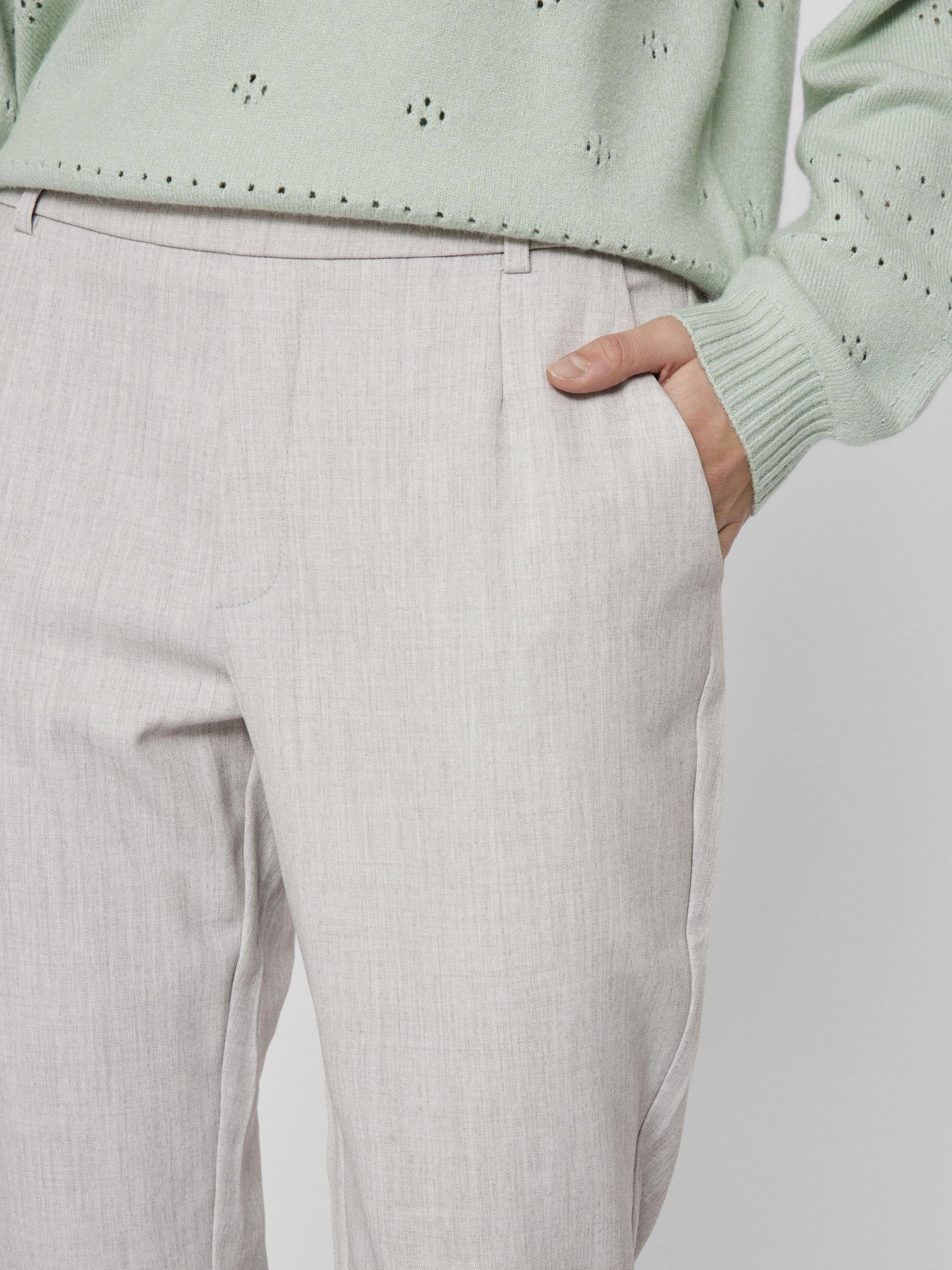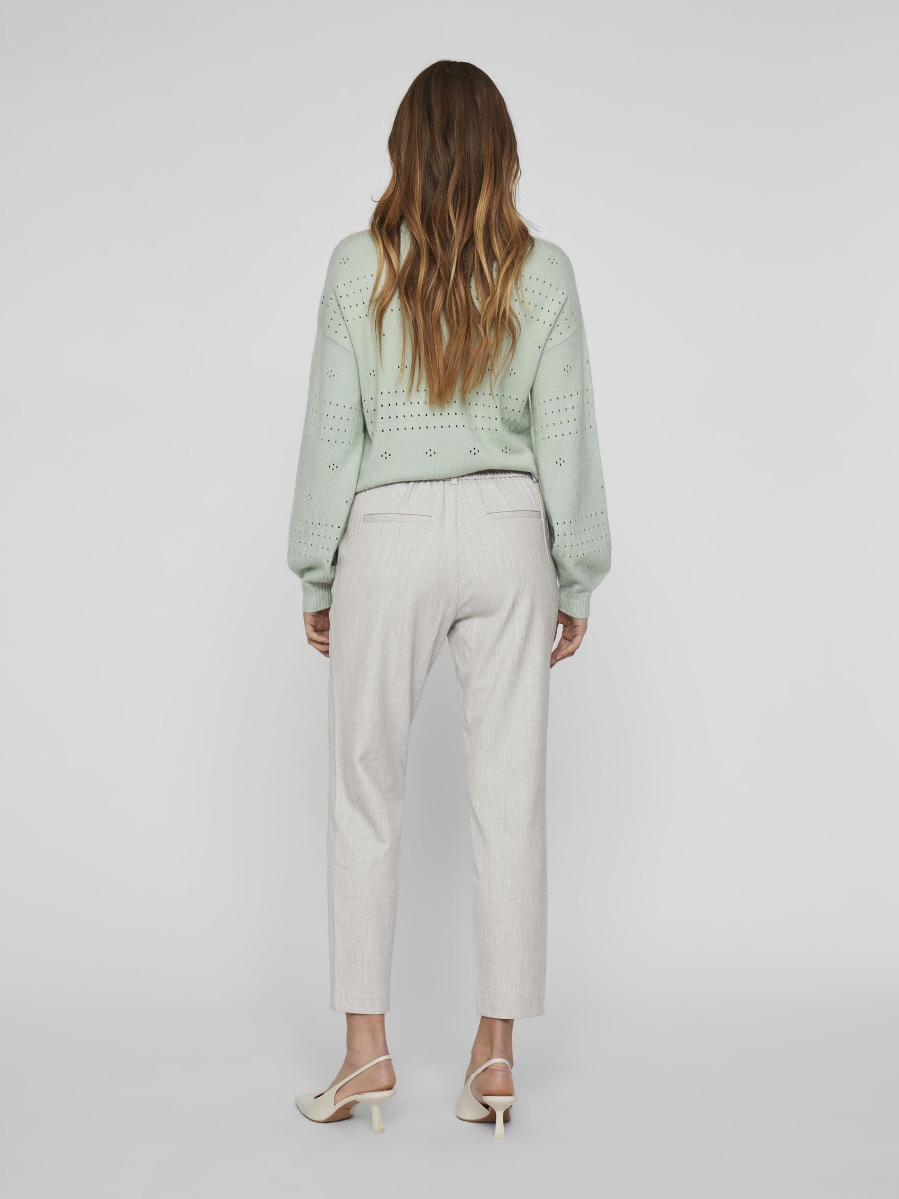 – High waist pants- Stretch-back waist- Faux zip fastening- Side pockets- Decorative back pockets- Belt loops – Straight, slim fit- Inseam: 69 cm in size 38- Frontrise: 28 cm in size 38