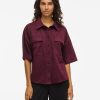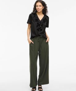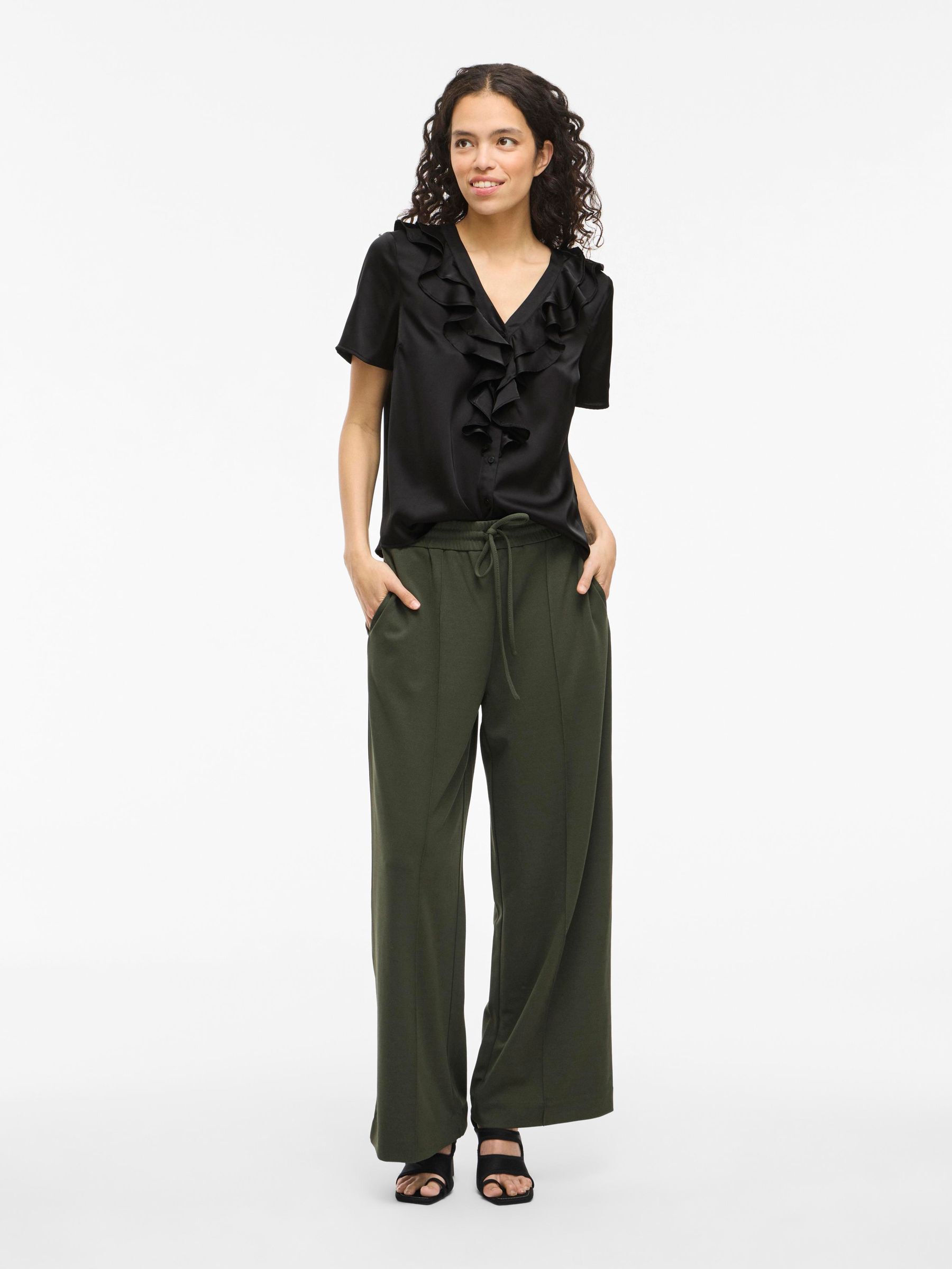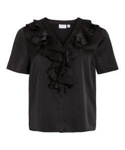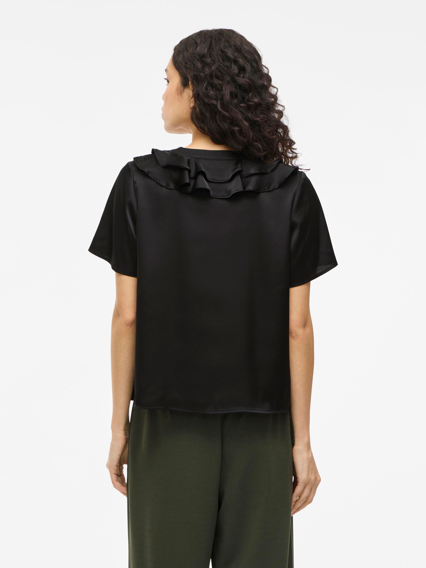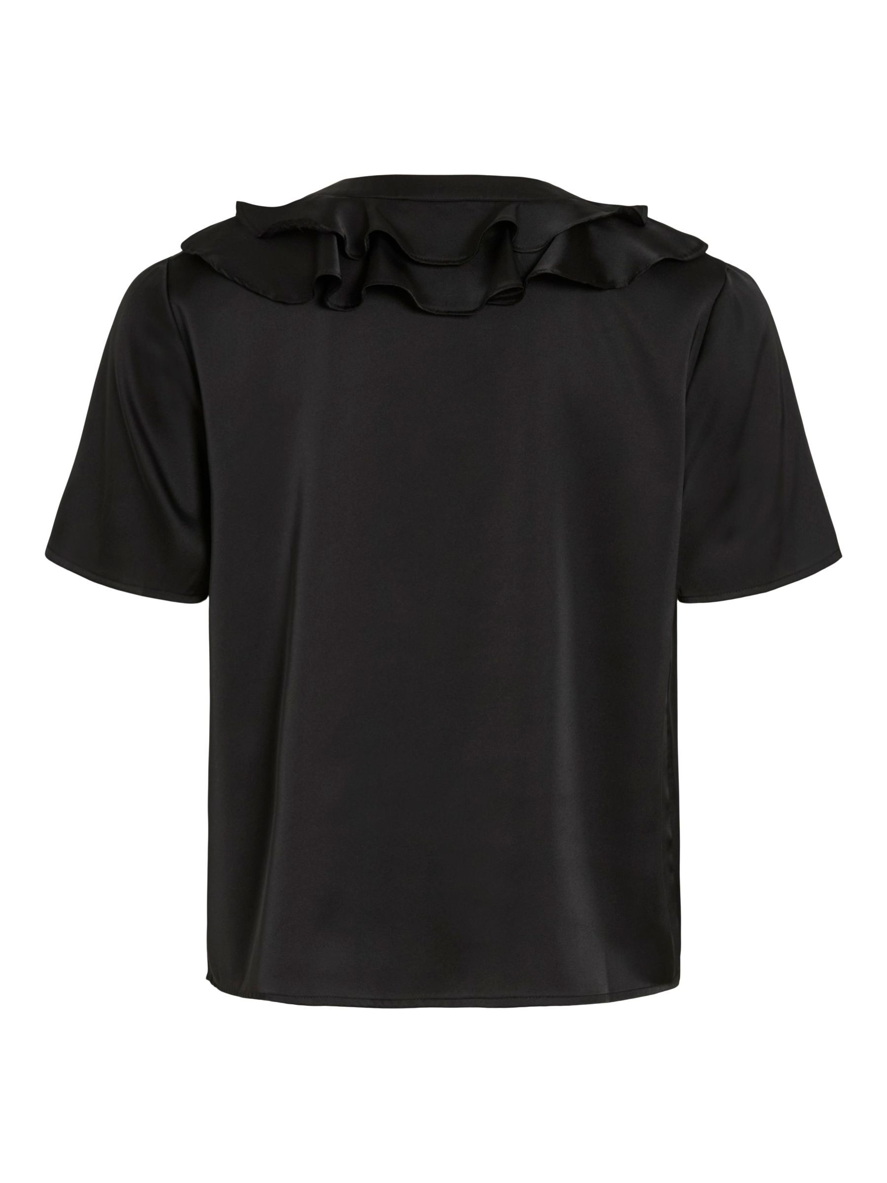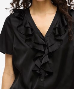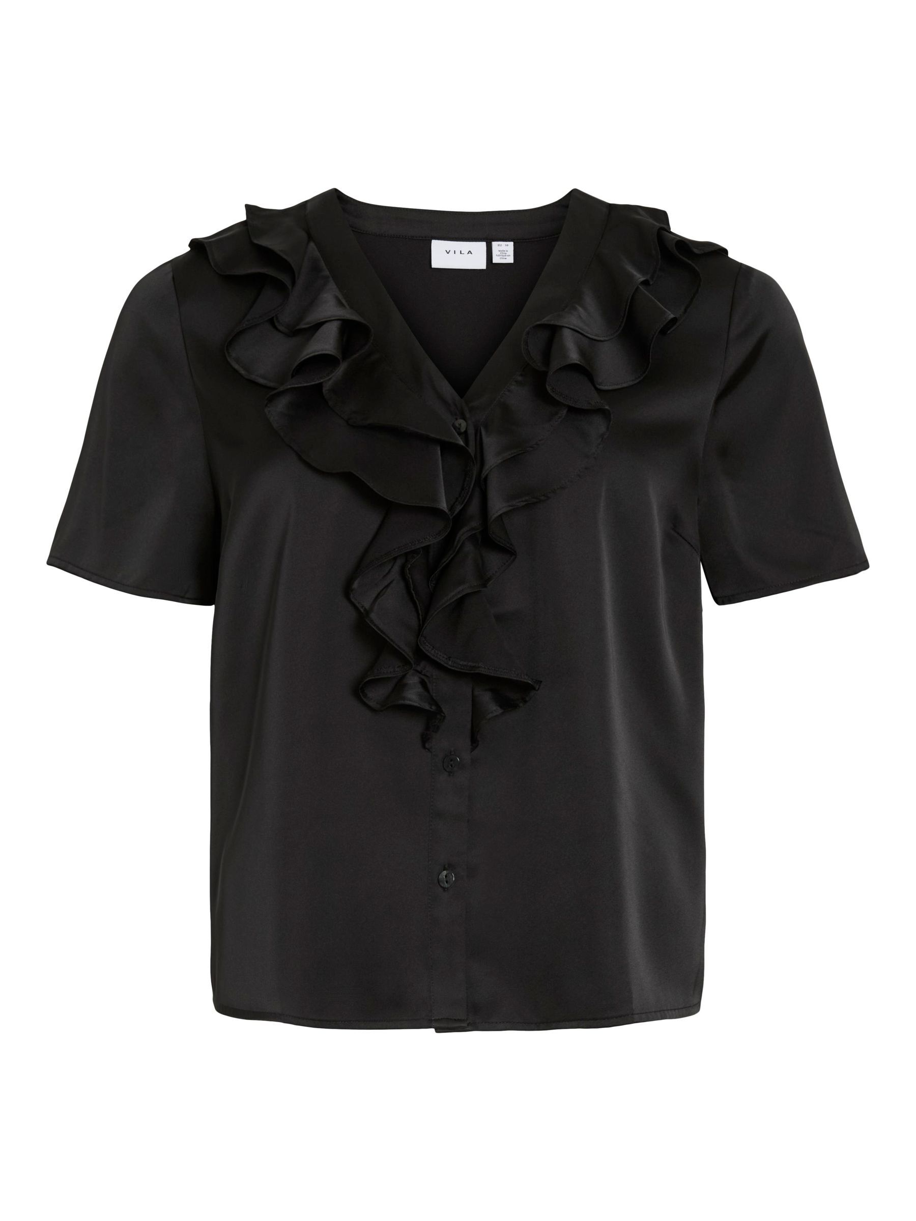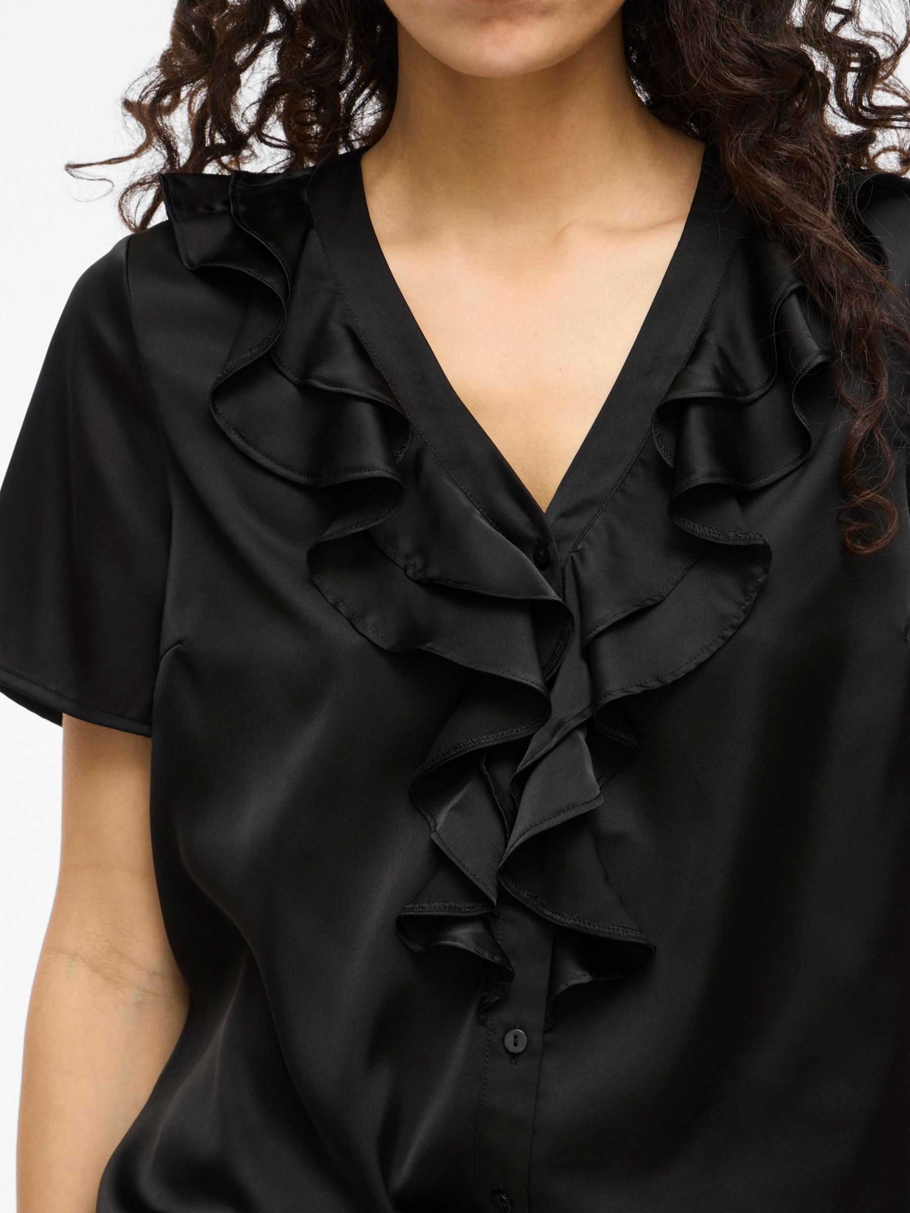 • Short-sleeved shirt with frill details• V-neck• Front button fastening• Satin-look• Regular fit• Length: 60 cm in size 38• Sleeve length: 23 cm in size 38