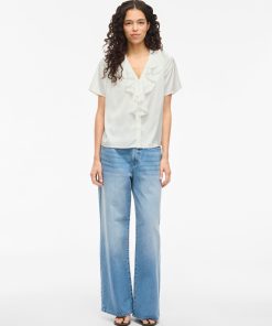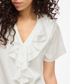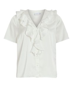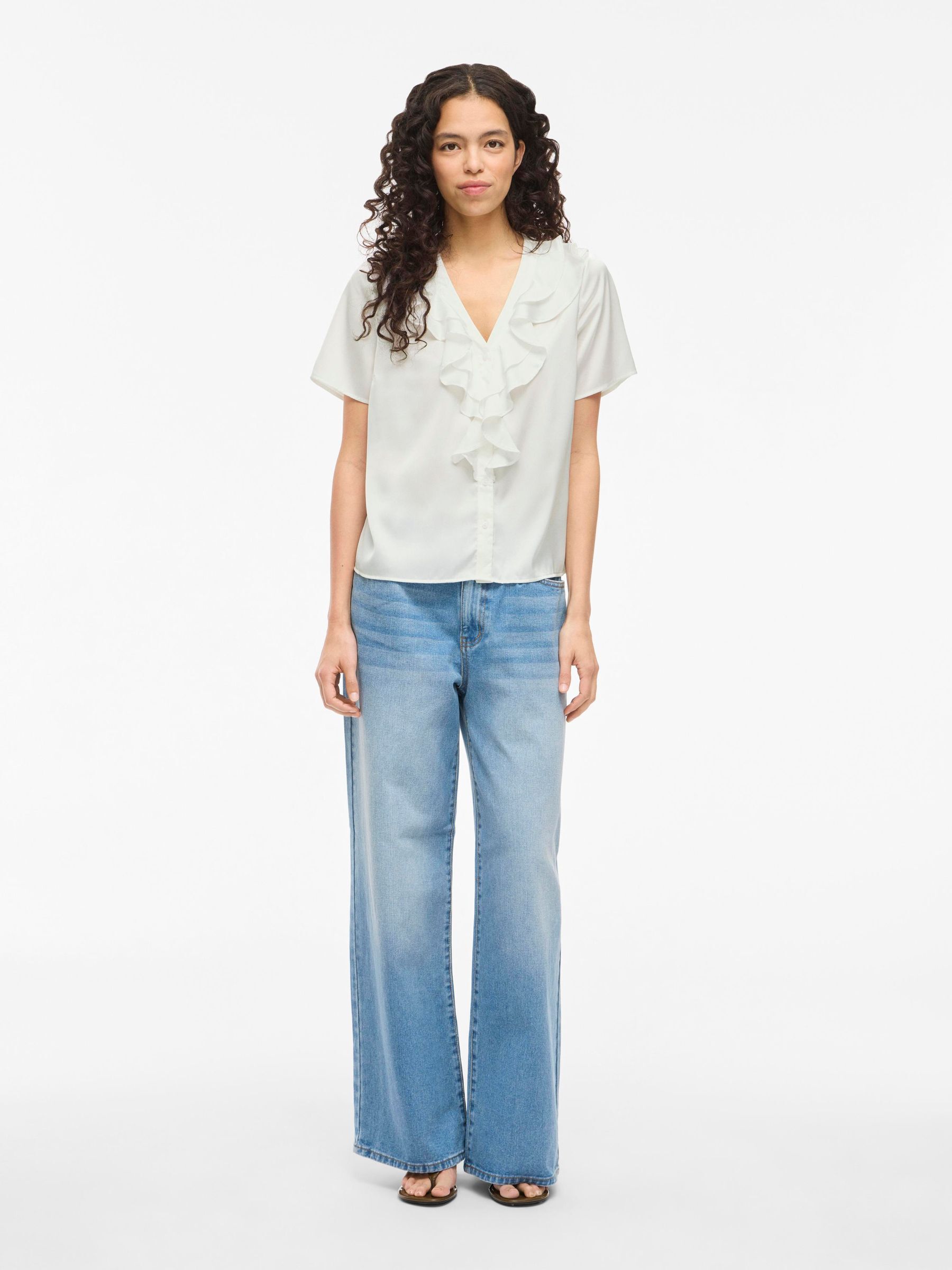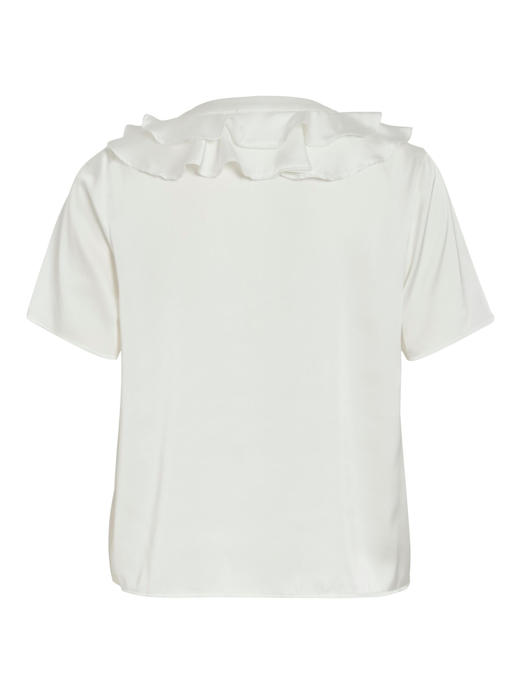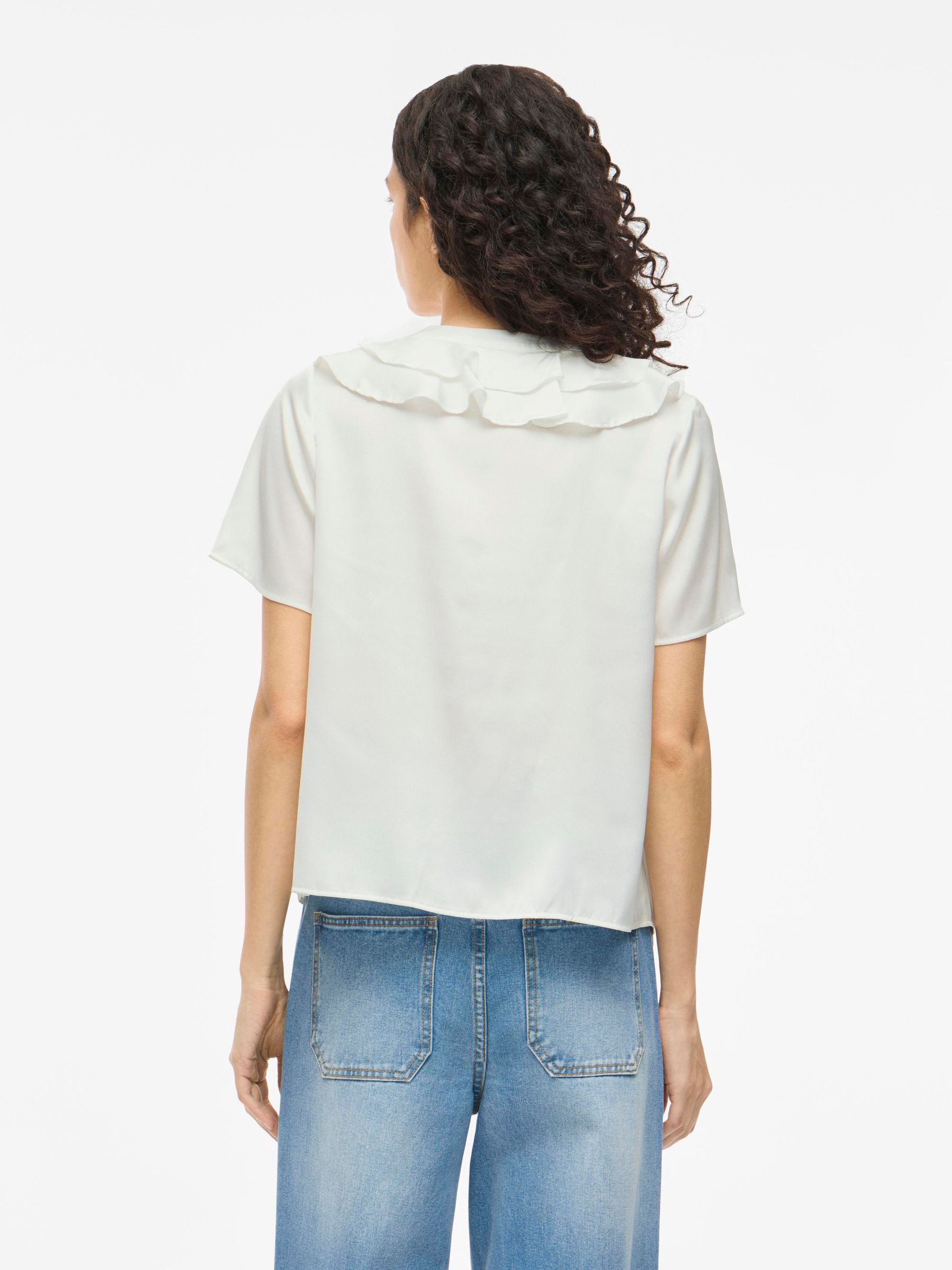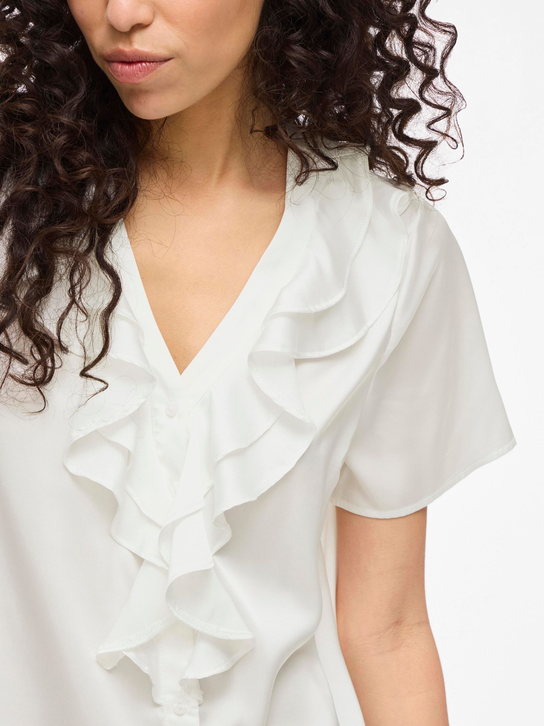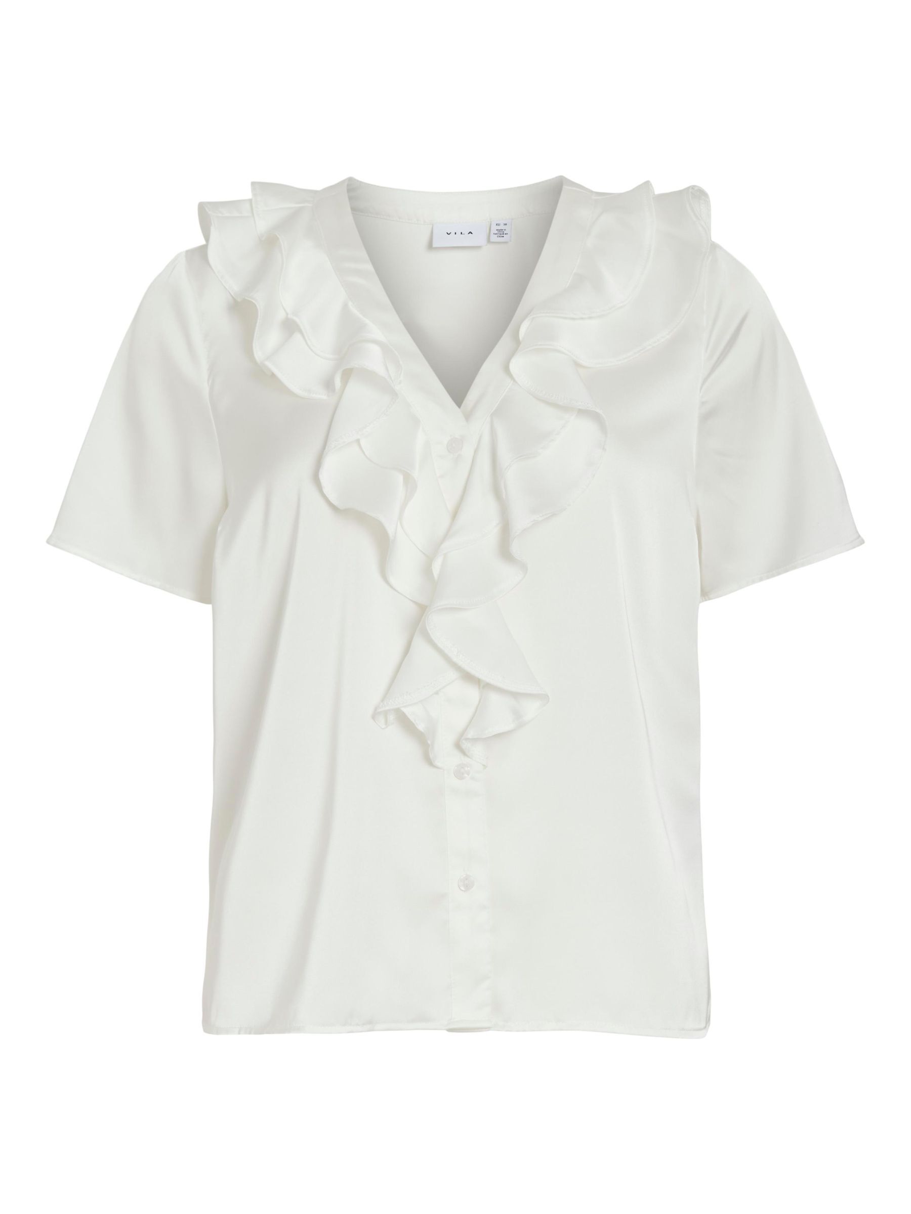 • Short-sleeved shirt with frill details• V-neck• Front button fastening• Satin-look• Regular fit• Length: 60 cm in size 38• Sleeve length: 23 cm in size 38
